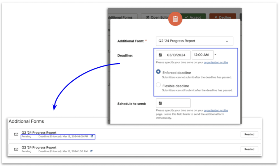 Keep a Flexible Deadline on your Additional Forms for things like quarterly, 6-month, or yearly reports. The deadline gives the applicant a general “target” to submit requested data by!