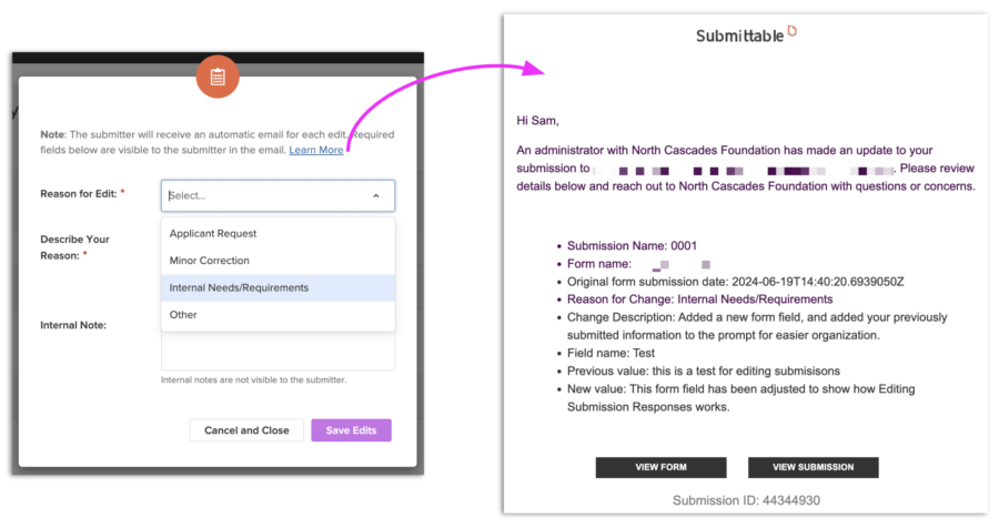 How it works: To edit a submitted response, navigate to the Submission Details. Then, click the ellipsis next to the response, make the necessary edits, and provide a reason and description for the change. This action is logged in both your activity log and the submitter’s, and the submitter will be notified via email of any changes made. Read more about it in this Help Article.