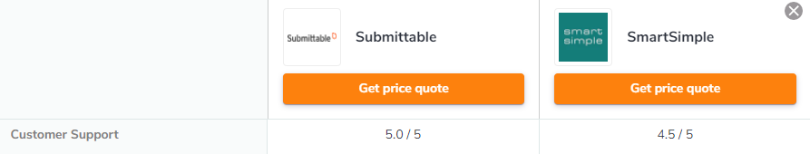 Customers rate Submittable 5.0/5 for Customer Support vs. 4.5/5 for SmartSimple on on review site Software Advice.