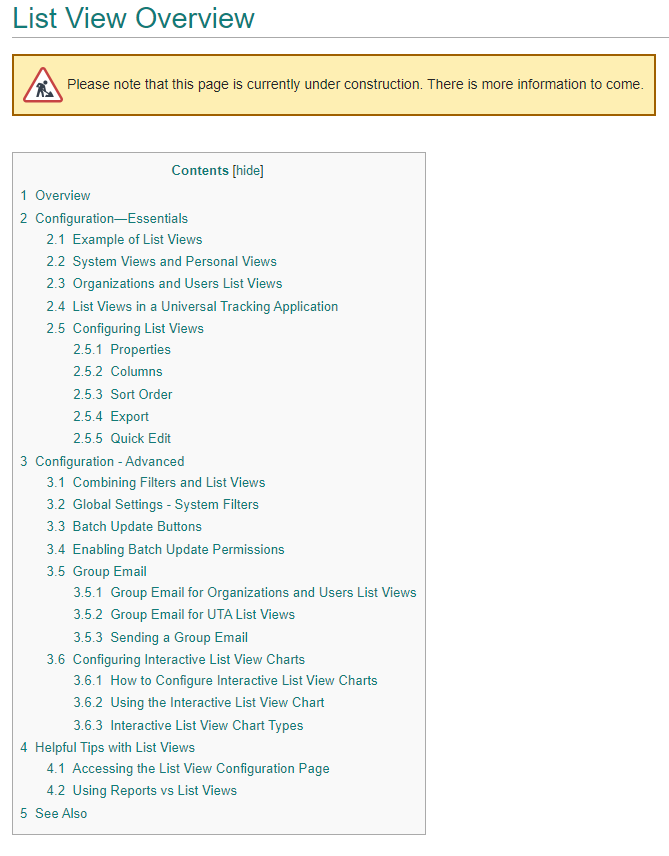 SmartSimple, by contrast, uses a Wiki for its help site, with articles divided into categories, subcategories, and pages. For example, the category “Security” includes three “subcategories” and 58 “pages,” each of which is an article. Many articles include a long, Wikipedia-style table of contents.