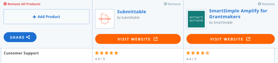 Customers rate Submittable 4.9/5 for Customer Support vs. 4.4/5 for SmartSimple on on review site Capterra.