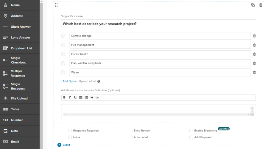 Submittable’s drag-and-drop form builder makes it easy to see all available question types and to edit questions and response options.