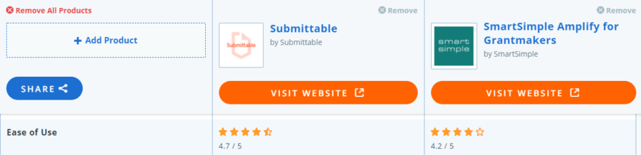 Customers rate Submittable 4.7/5 for Ease of Use on review site Capterra vs. 4.2/5 for SmartSimple.
