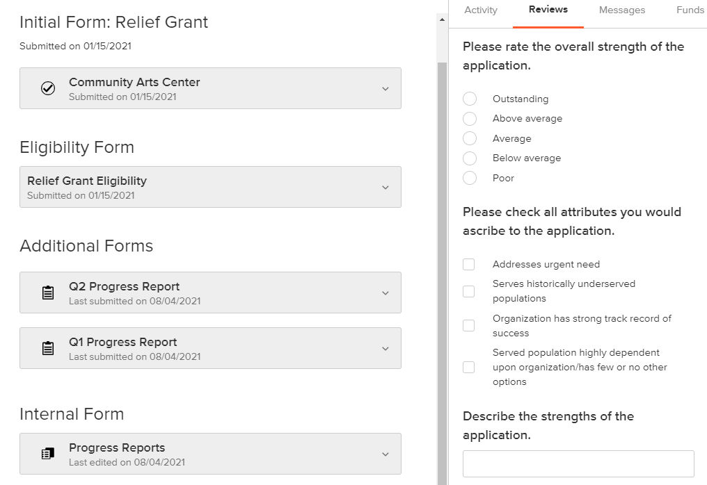 Where your technology can help is when it comes to making all of the data, including data sourced by your team, available to your review team. Look for a platform that includes internal forms, which you can design according to your needs in order to input and store data from your team within the reviewer portal. Bonus if the internal forms feature allows for file uploads, so that your team can upload conversations with grant seekers and other media.