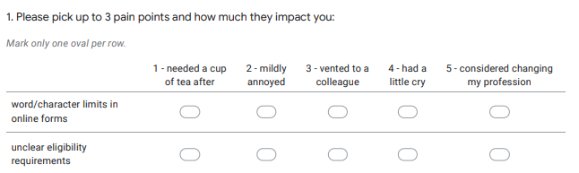 The #FixTheForm survey invited respondents to pick their top three pain points, and rate their negative impact.