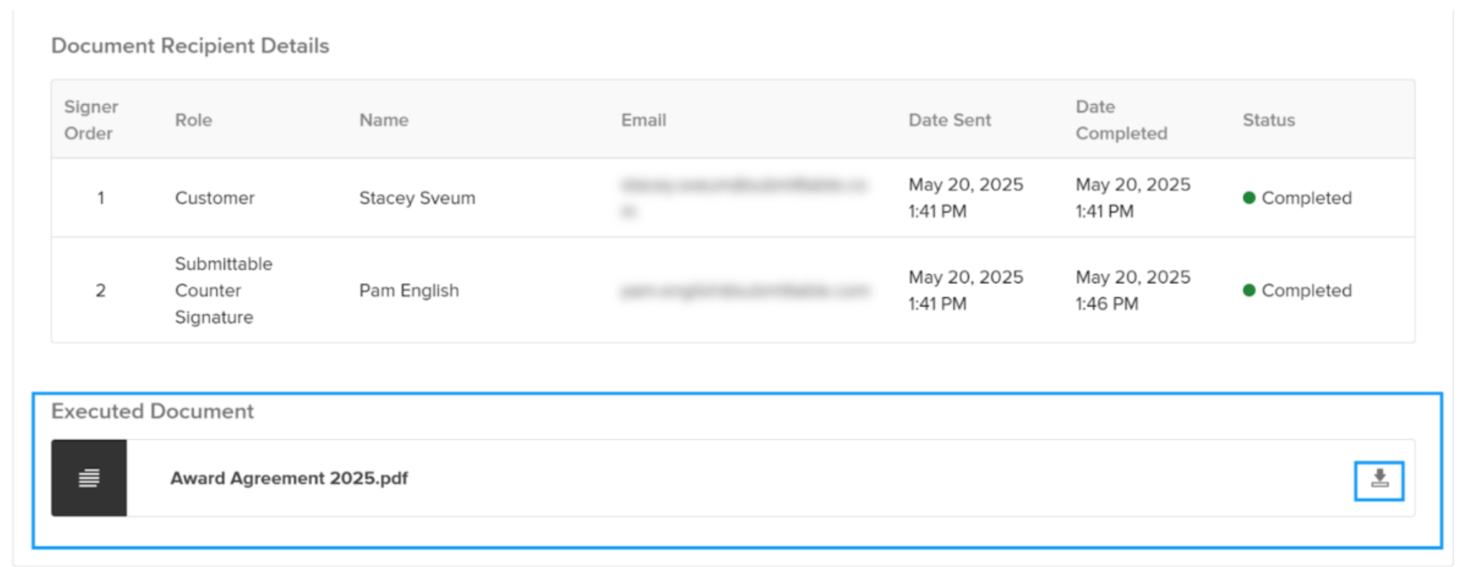 Access to executed documents: Once everyone's signed on the dotted line, you can download the fully executed document directly from your submission—no more platform hopping required.