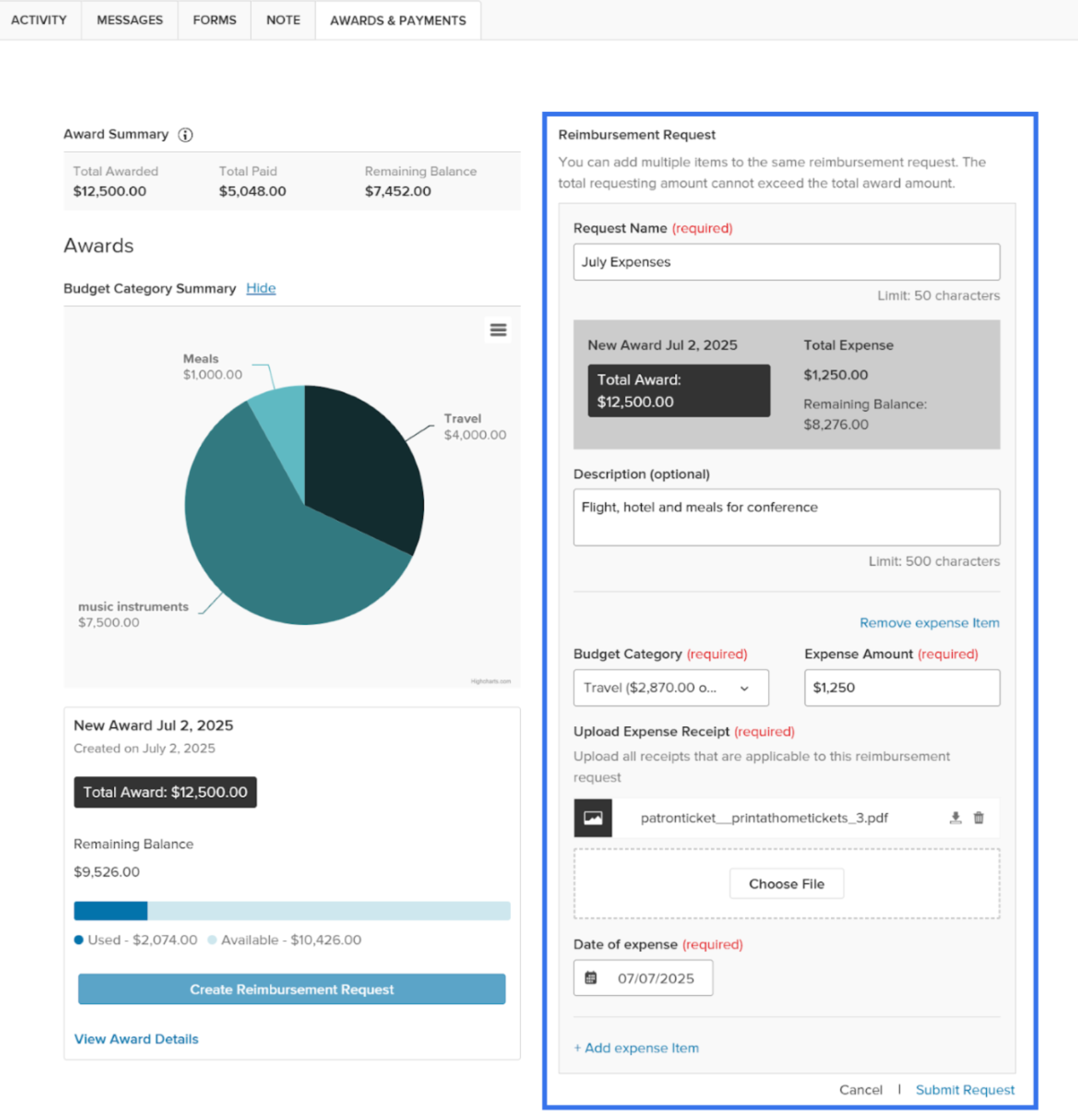 Real-time financial visibility: See exactly how funds are being used across awards and budget categories as it happens, plus track how much you have left in each category.