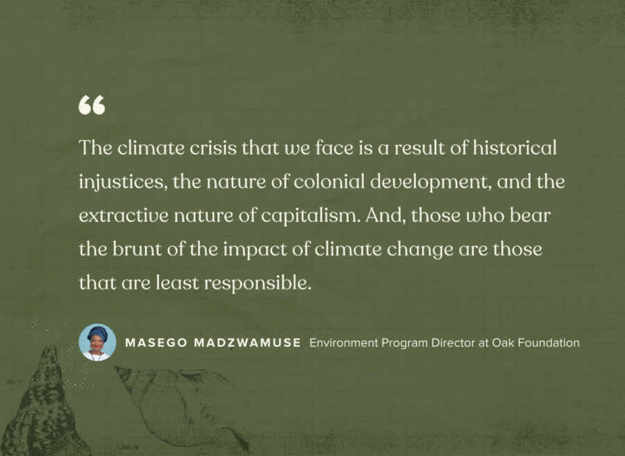 Climate change is a global issue that affects us all, but not all of us are affected equally. As Masego Madzwamuse from the Oak Foundation points out, “The climate crisis that we face is a result of historical injustices, the nature of colonial development, and the extractive nature of capitalism. And, those who bear the brunt of the impact of climate change are those that are least responsible.”