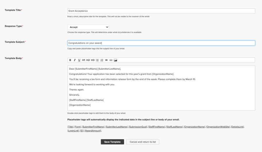 Use an acceptance template in Submittable to proactively communicate with award recipients.