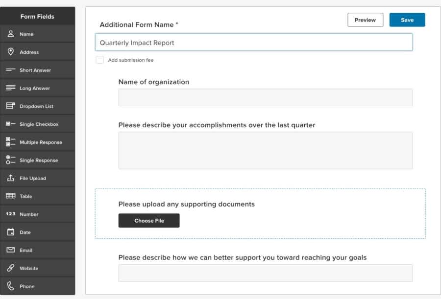 Submittable’s drag and drop form builder includes form logic to help grantmakers quickly create custom application forms that adapt to applicant responses.
