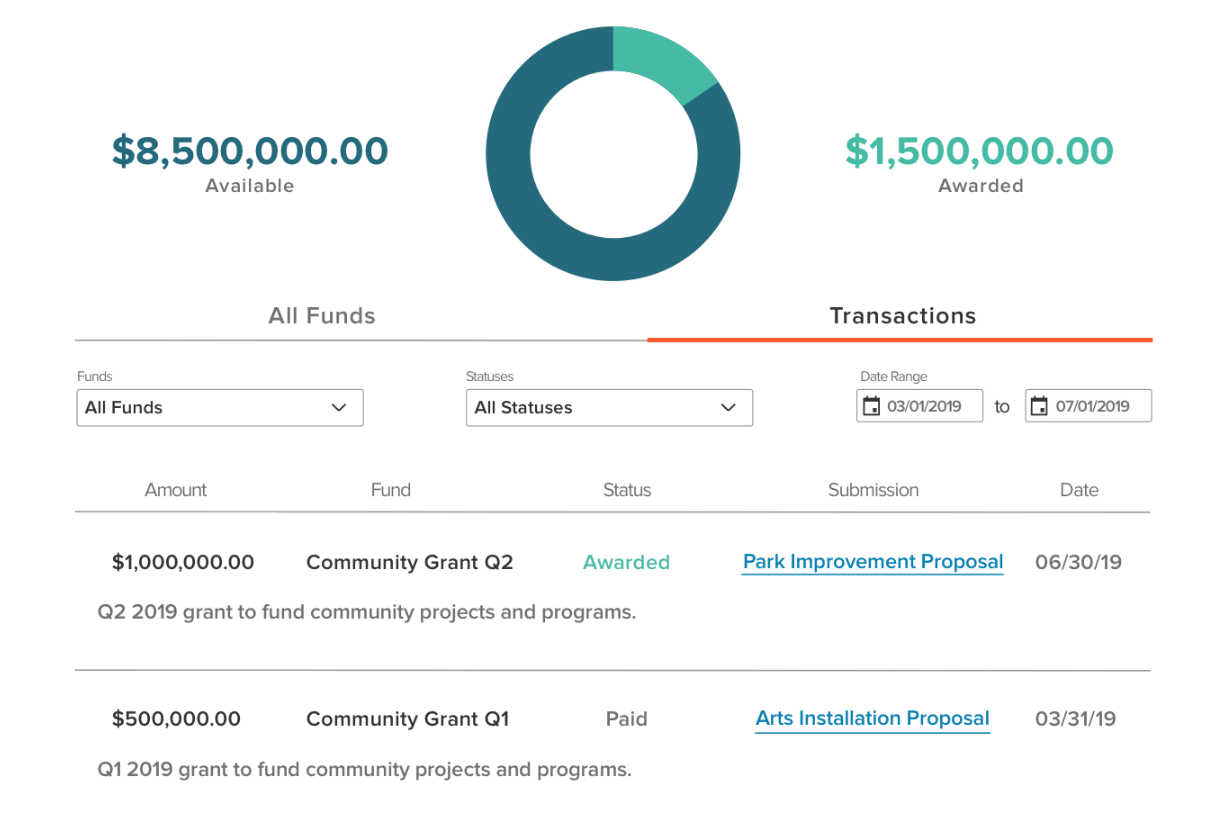 Submittable’s Funds feature is the easy way to track awards and payments, stay on budget, and always know your current capacity to give.
