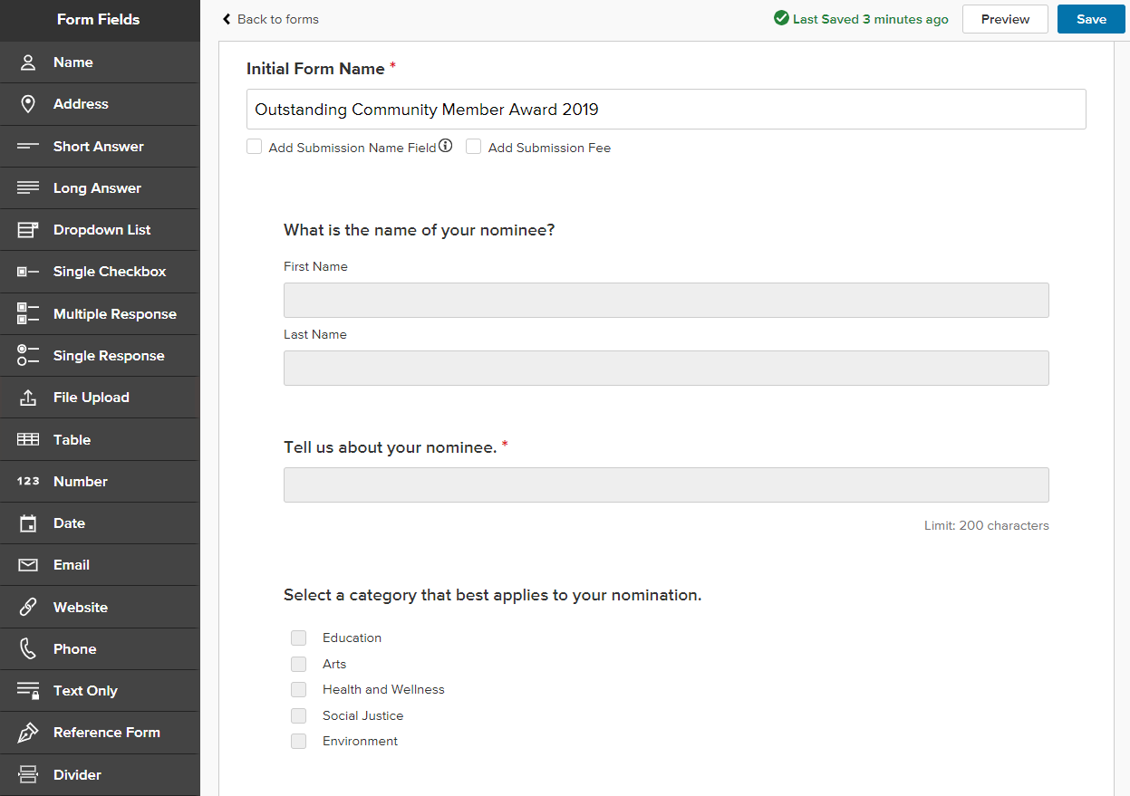 Use a form builder like Submittable’s to quickly create and edit your application form. Make sure the tool is both intuitive and feature-rich so you can easily customize your application to your exact requirements.