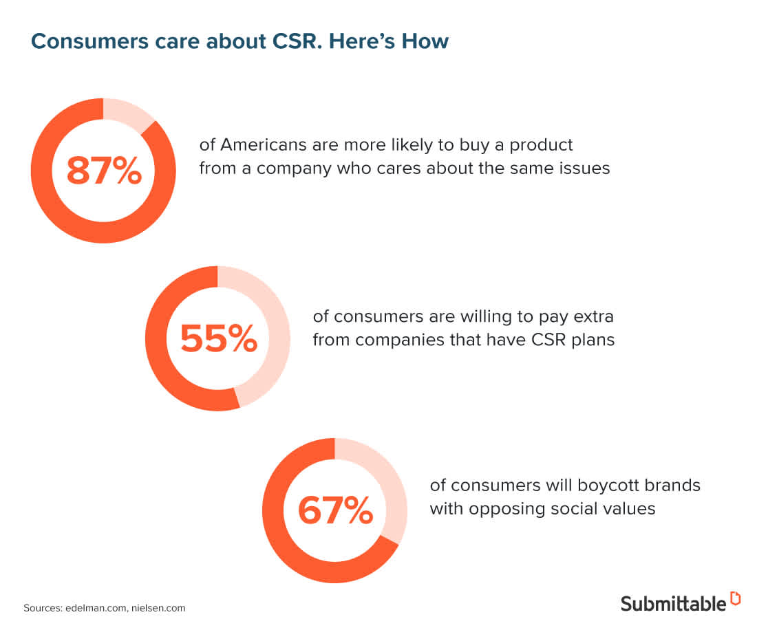 A huge 87% of American customers said they’re more likely to purchase a product if a company advocated for an issue they cared about, according to Cone Communications. Consumers are now looking out for socially responsible companies and rewarding it with brand loyalty. Knowing what issues weigh heaviest on their minds, and aligning those issues with your own company’s mission will guide you toward a CSR strategy that works for everyone.