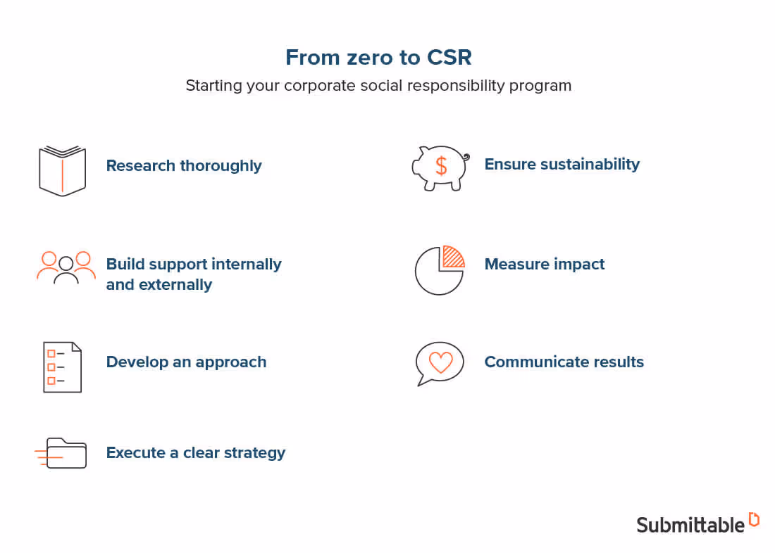 - Before beginning the actual work of your CSR program, set up systems for evaluating your impact. Make sure to set clear guidelines for initiative success and communication with relevant stakeholders about your progress.