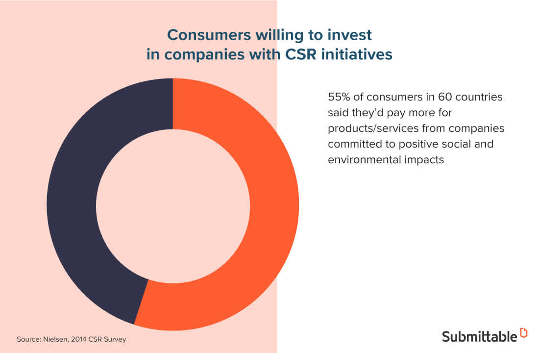 When it’s well-executed, CSR helps your brand stand out to consumers as a great investment, especially as a repeat customer. The data backs up this notion, with Nielsen reporting that more than half of consumers would willingly pay more just to buy from companies seen as contributing to positive social impacts.