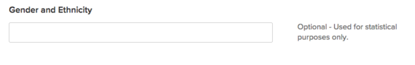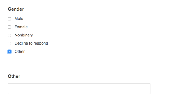 Categories are one of the biggest culprits of exclusion. While preset options can be helpful for form efficiency, they also imply that your potential applicant should fit into one of the categories you listed. Providing users a blank field to self-describe (example below) and use the answer they find most accurate for themselves establishes respect and makes applicants feel affirmed and included.