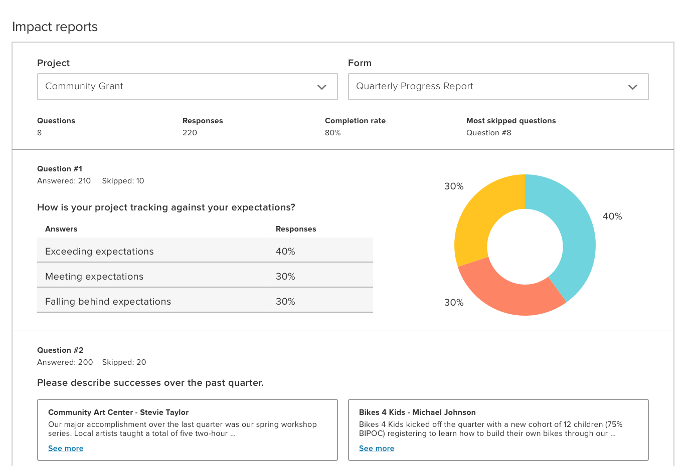 Social impact platforms that allow you to collect direct data from stakeholders and beneficiaries empower you to measure outputs and outcomes. Submittable’s Impact Reports feature even aggregates that data for you, enabling you to tell a story complete with quantitative and qualitative data.