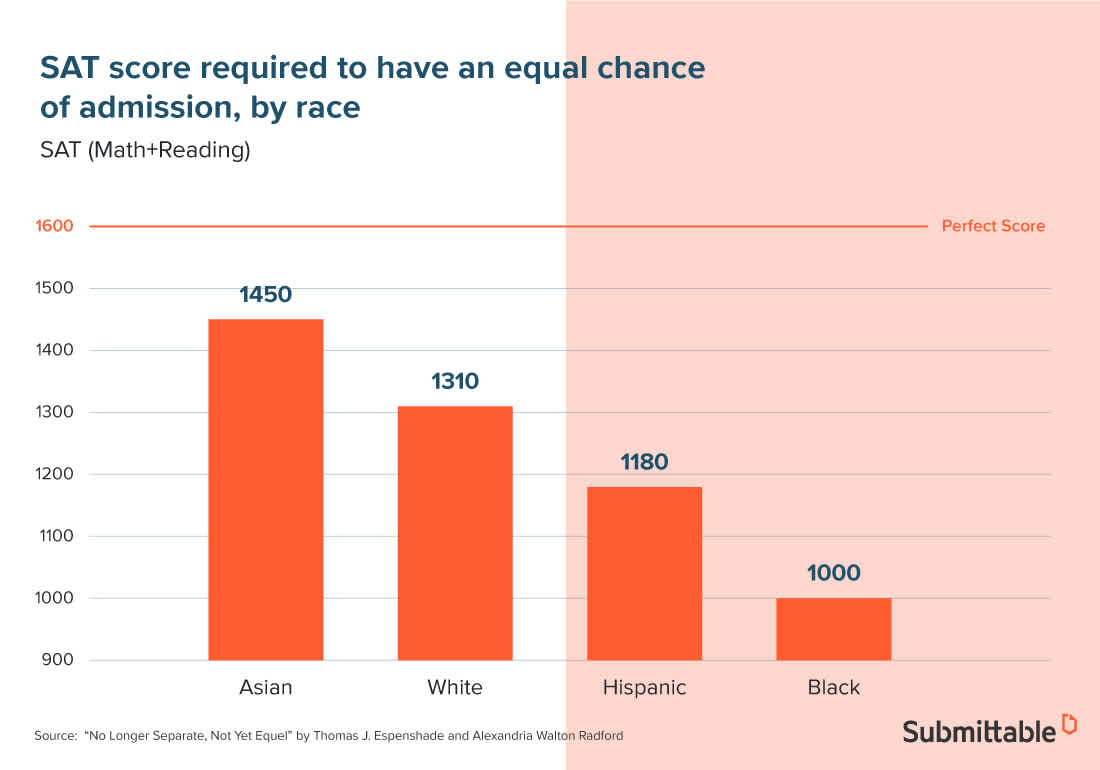 Their research showed that Asian-Americans have the lowest SAT bracket acceptance rate in higher education due to being the most under-represented. They would need to score on average 140 points higher than white students, 270 points higher than Hispanics and 450 points higher than black students.