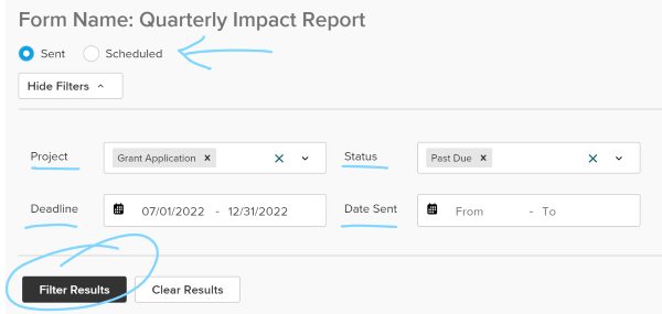 From the Additional Forms page, toggle between sent vs. scheduled forms, and filter by Project, Status, Deadline, and Date Sent/Scheduled, and Status. Once filtered, you can rescind, add or edit scheduled dates or deadlines, open or close for editing, or send reminders (all in bulk!)