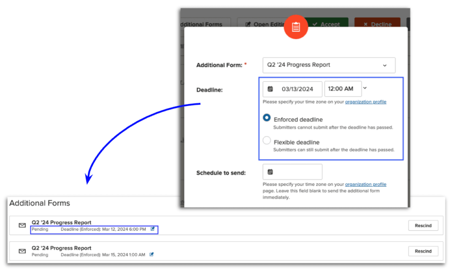Scheduling is available now to all clients with Additional Forms—at no additional cost. Together with deadlines, released earlier this year, we hope that progress reporting and other post-application processes are now more streamlined and easier to manage. Plus, stay tuned for collaboration—coming soon! Learn more.