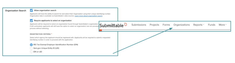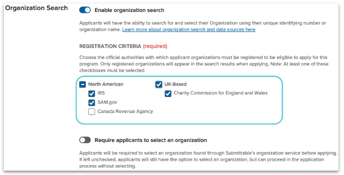 Administrators (Level 3 or higher) can choose keep the Organization Search functionality optional or as a required step for applicants. Once turning on the ‘Enable organization search’ functionality, administrators can select the Registration criteria of their choice. This sets which data base and identifiers the administrator will accept from submitters.