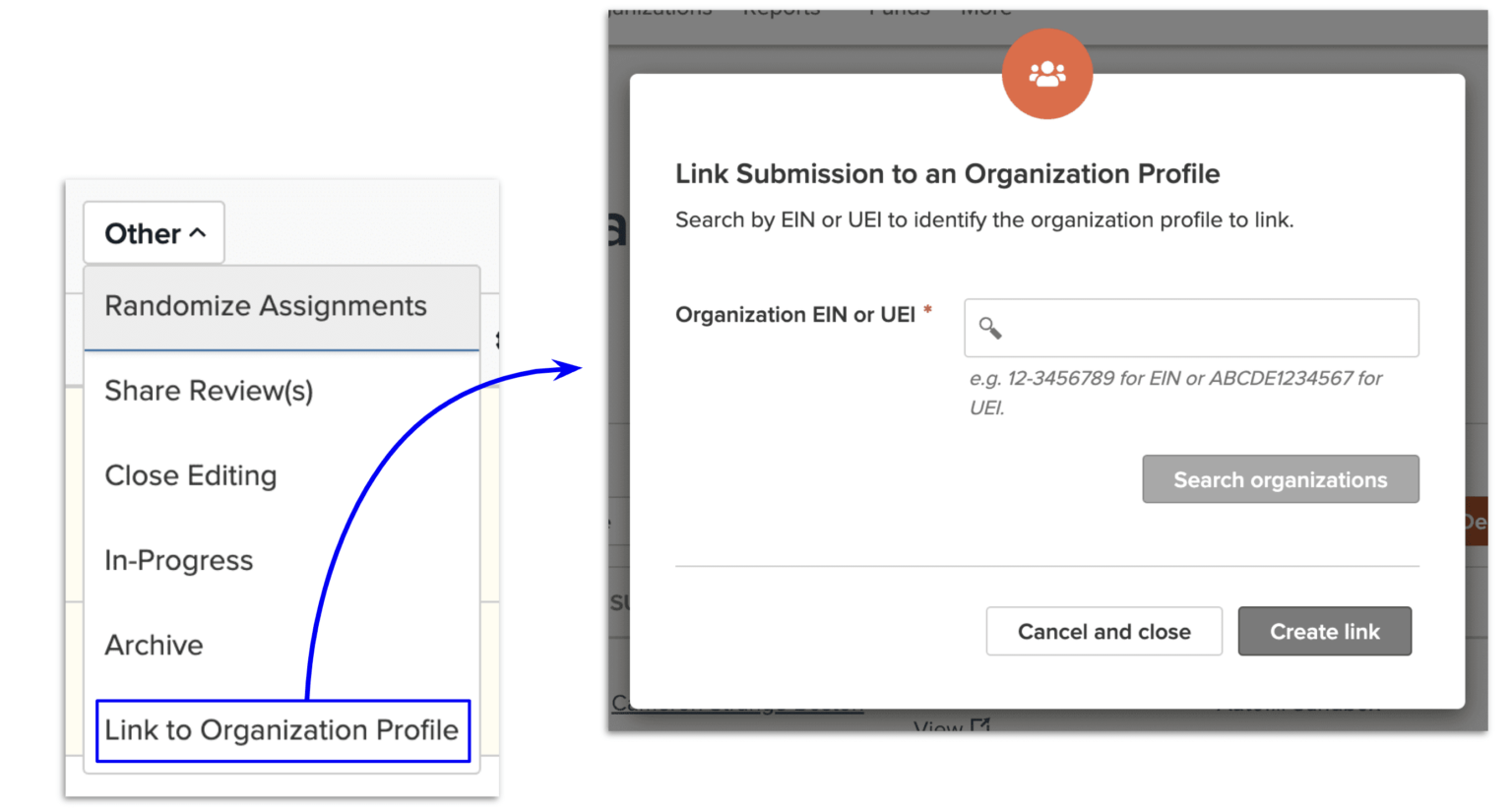Program administrators that utilize the CRM-like tool Organization Profile now have the ability to manually link applications with an organization or business by searching with the corresponding unique entity ID (UEI or EIN). This action can be completed from the Submission List and Details view.