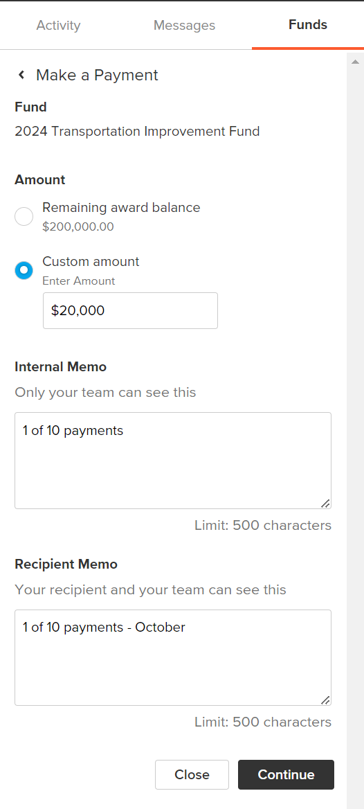 Both memos will be reflected in the Funds tab of the submission detail view, as well as on the Transaction tab within Funds Tracking (see below).