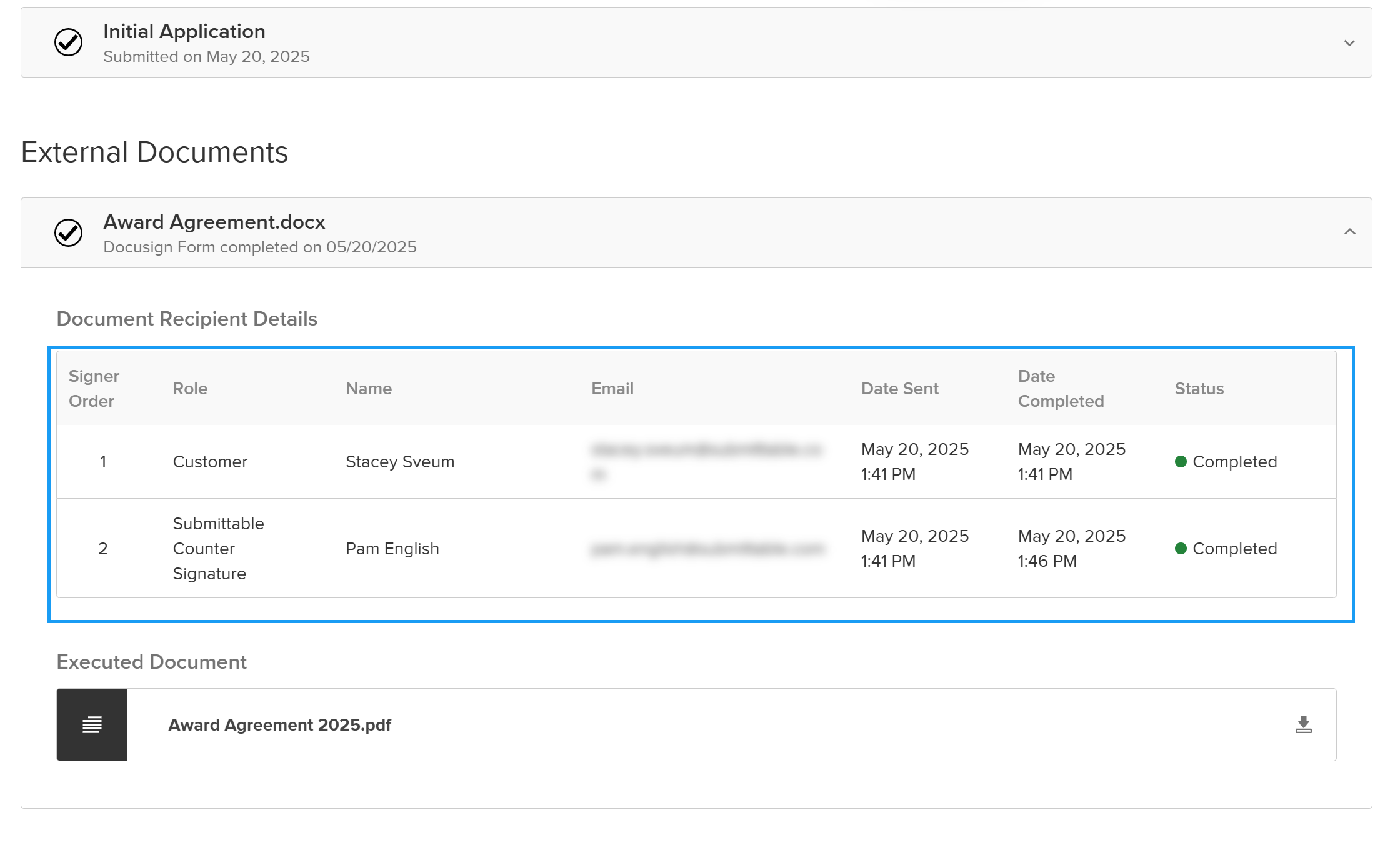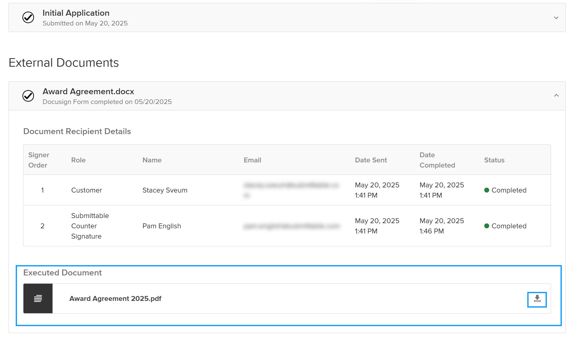 Executed documents are accessible from the same External Documents section where you track signing progress, creating a seamless end-to-end document management experience within your Submittable workflow.