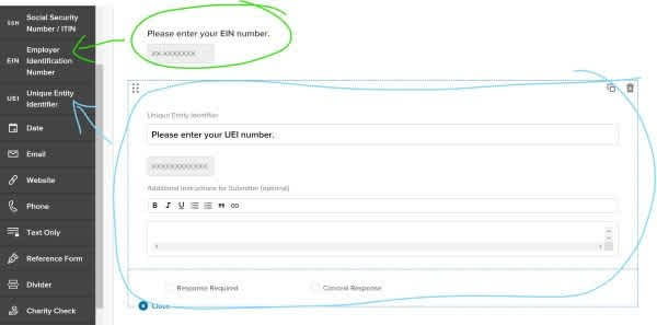 Each of these form fields is validated according to established rules for the identity number, helping reduce human errors and saving valuable time (to say nothing of frustration) later for you and your applicants. The EIN and UEI form fields are available now at no cost to all customers.