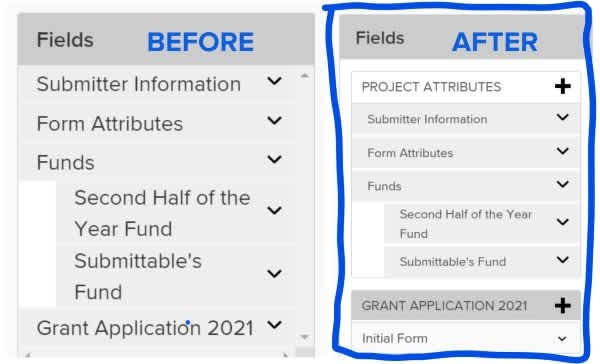 Submitter Information, Form Attributes, and Funds are now housed under Project Attributes.