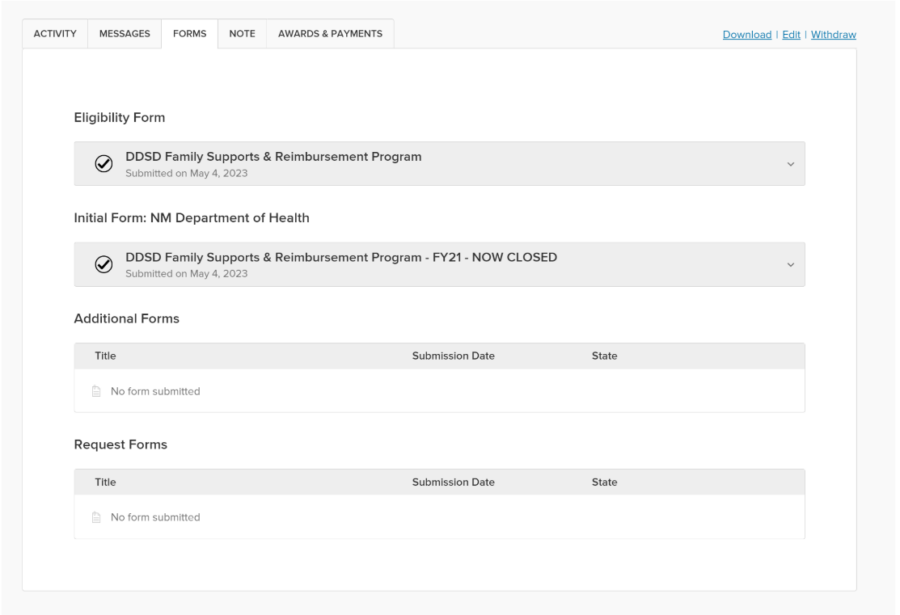 Applicants now have an Awards & Payments tab within their personal Submittable account, viewable if they select any submission to an organization with Funds Tracking.