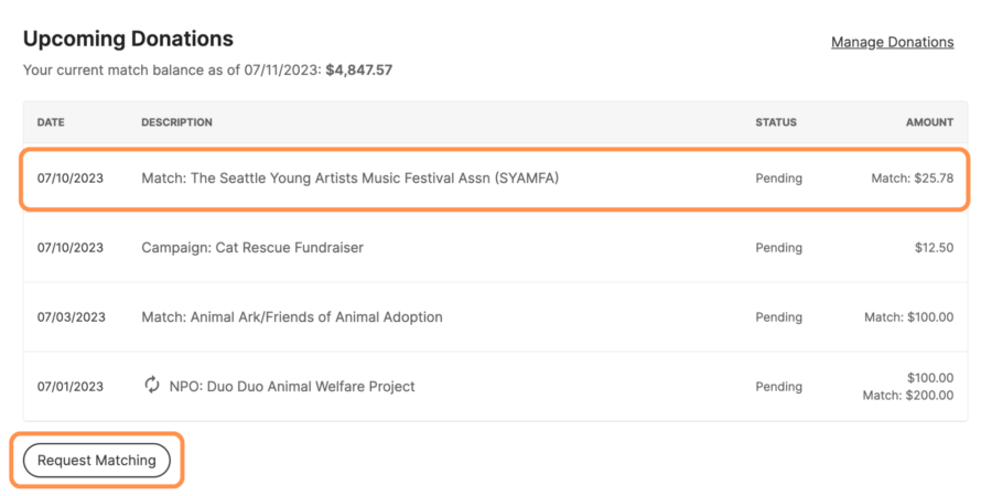 Matching is available on Giving Campaign donations, and one-time and monthly donations to specific nonprofits.