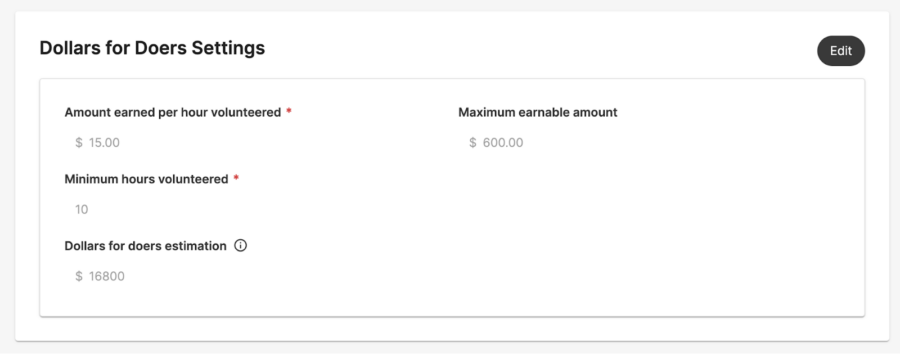 Incentive programs are designed to encourage participation in opportunities such as employee giving and volunteering. With Dollars for Doers, you can reward colleagues for volunteering with funds that can be donated to NPOs and causes that matter to them. With just a few clicks, set an hourly rate, enable events that qualify, and watch the increased impact your team can make together.