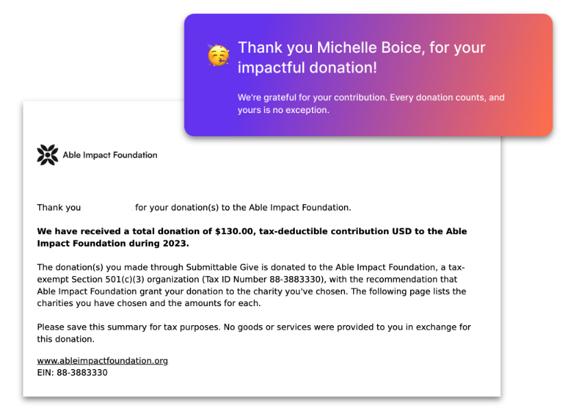 Users can donate across the platform without worrying about losing receipts. Submittable ensures all donors receive an annual donation summary detailing the total amount donated and every contribution allocated to individual nonprofit organizations (NPOs).