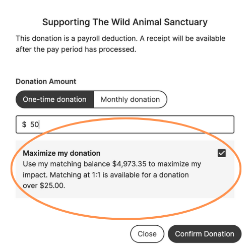 Matching is automatically selected (once your organization has enabled it). This means every donation an employee makes will be matched; Employees need to take action to opt out if they do not want a donation matched.