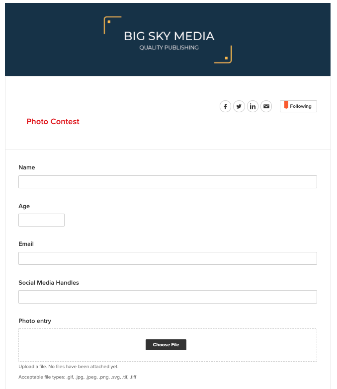 You’ll need a platform that includes a simple photo upload option and the ability to create a short form that collects the information you need—a contact email, the user’s handles on social media, a caption if needed, and the entrant’s name (and age if required in your state for contests.)
