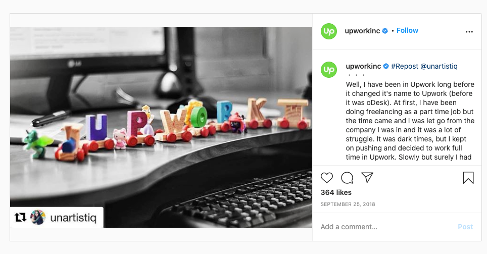Upwork, for example, ran a UGC contest asking entrants to share their freelancing success story via images and text, using the hashtag #UpworkSuccess.