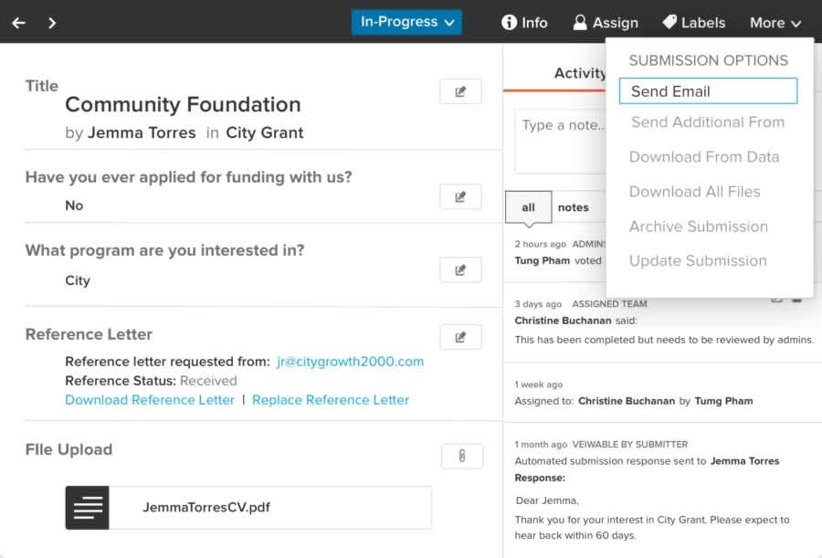 Submittable allows reviewers, grant applicants and administrations to communicate and collaborate through in-app, external, and bulk messaging, so everyone keeps informed and no messages are misplaced.