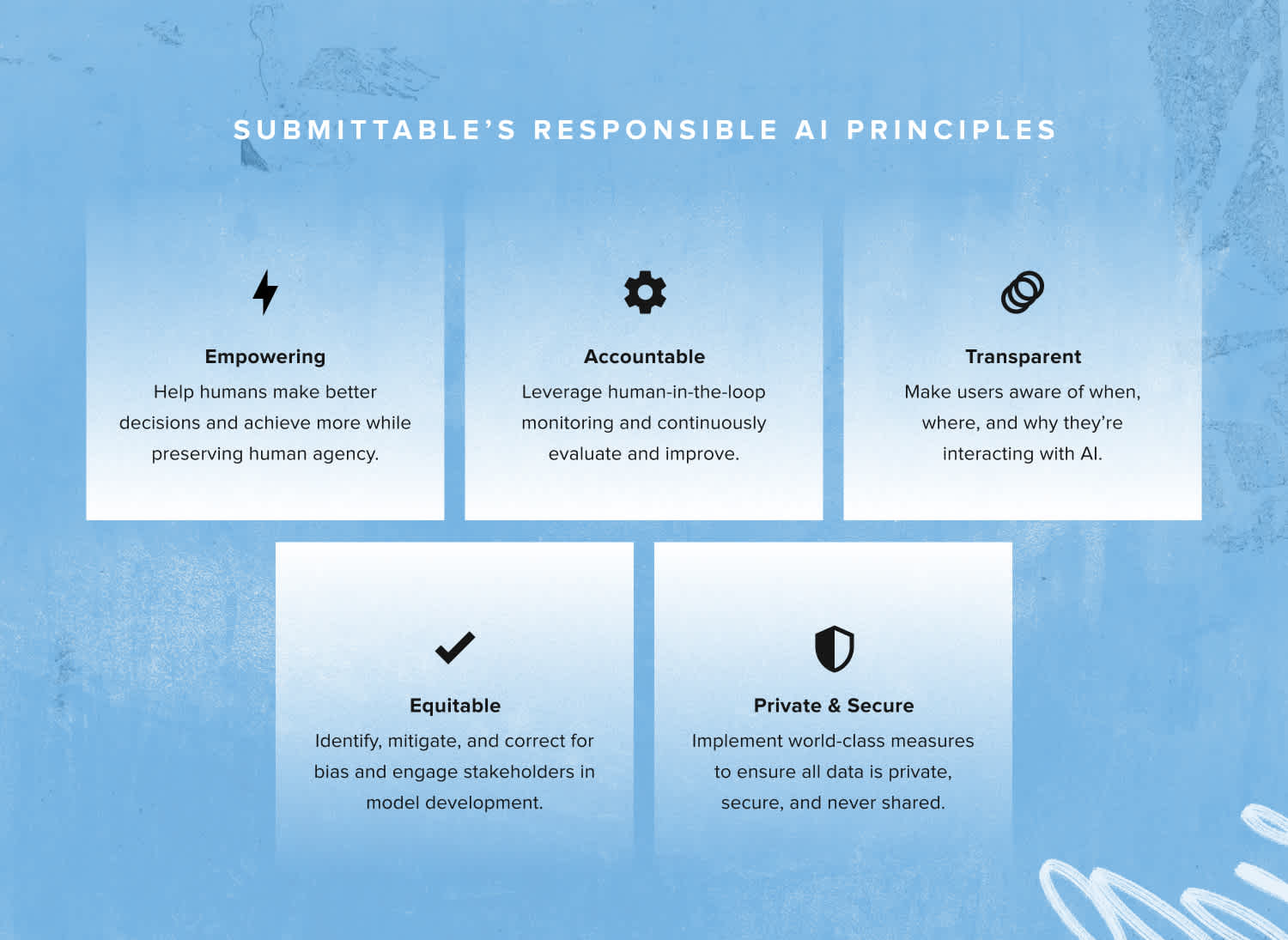 Today, on the precipice of the next phase of AI for Submittable, we’re sharing with our community the responsible AI principles that are guiding this work.