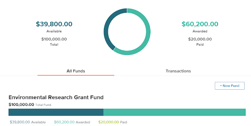 In Submittable, users can create multiple funds, and award and pay applicants in installments. Submittable’s funds dashboard also keeps everyone aware of their current capacity to give.