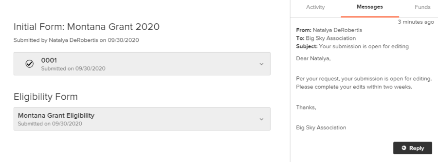 In Submittable, on the other hand, you can see all correspondence with applicants right within the platform; all messages are viewable alongside applications. There’s no need to dig through your inbox or toggle between tabs, and all reviewers have access to the correspondence.