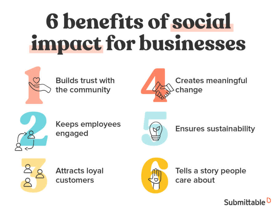 Social impact is the positive change your organization creates to address a pressing social issue. This can be a local or global effort to tackle things like climate change, racial inequity, hunger, poverty, homelessness, or any other problem your community is facing.
