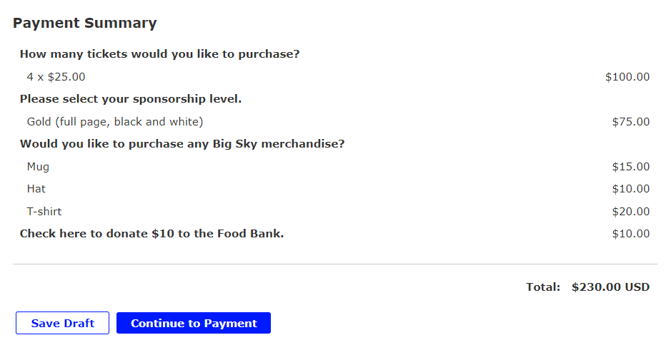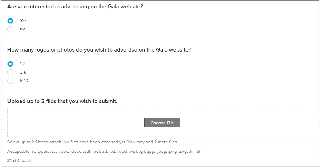 Sell products and services throughout your application form, such as merchandise or subscriptions, professional or consulting services, or sell tickets to an upcoming event.